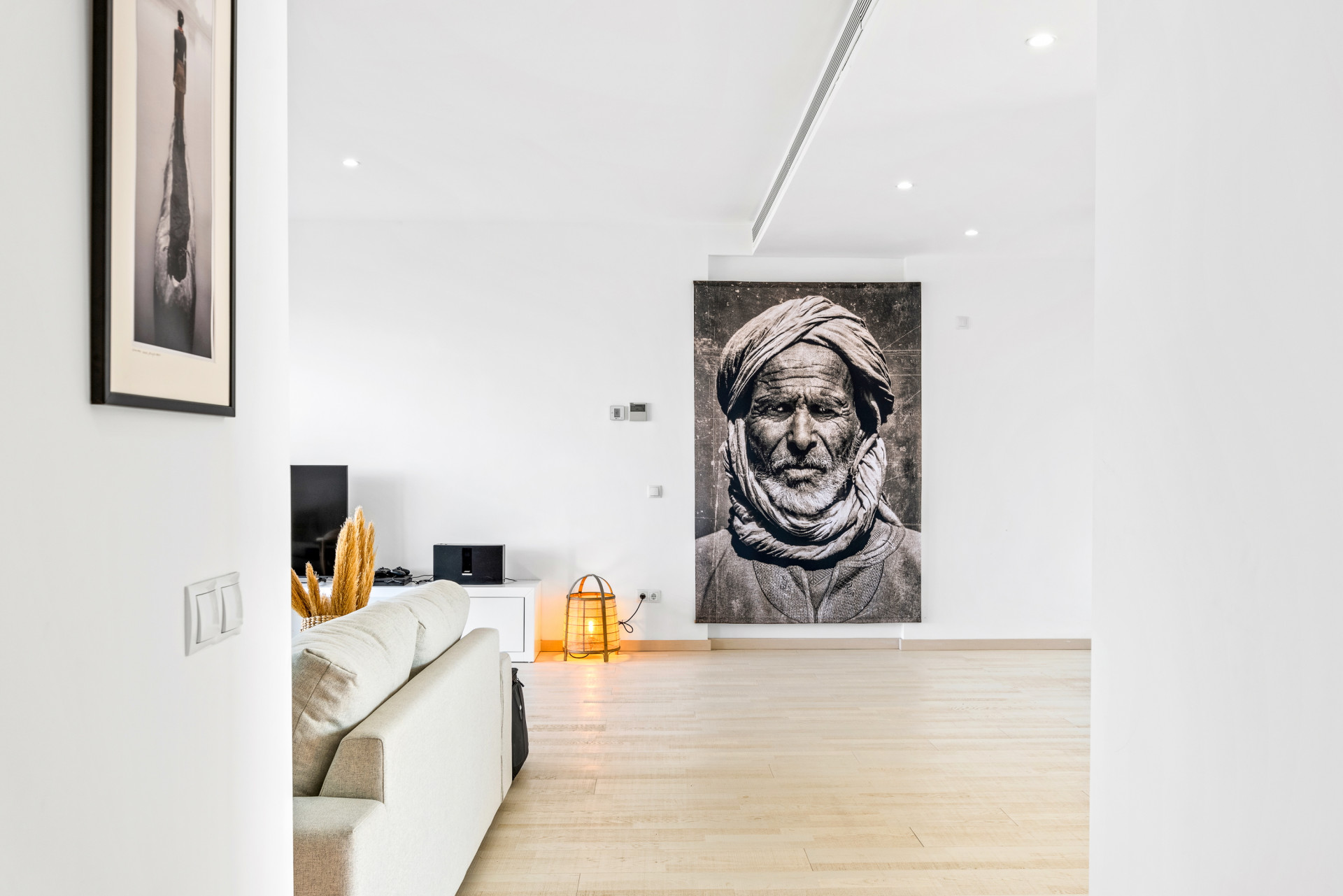The finishes throughout the apartment are of high quality, enhancing every corner with elegance and attention to detail. The modern open kitchen with Siemens appliances and a breakfast bar is perfect for hosting, and connects to a utility room.