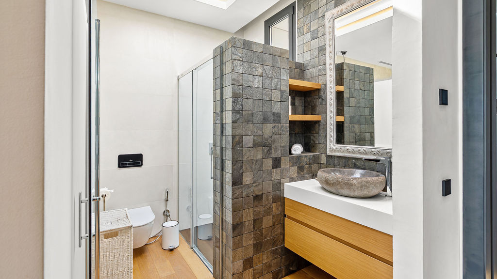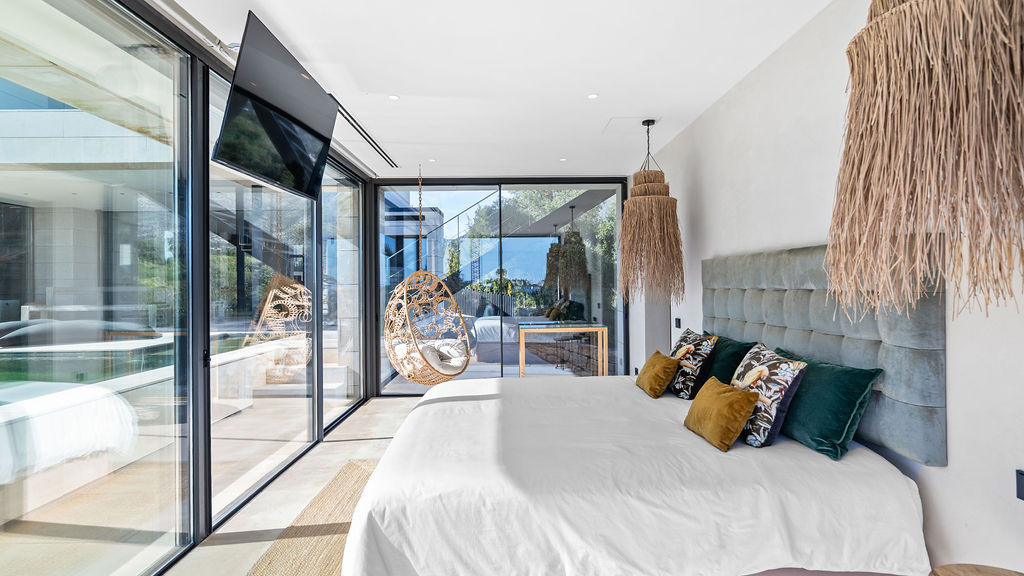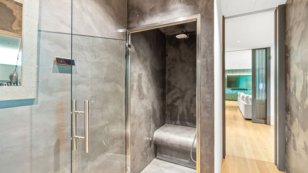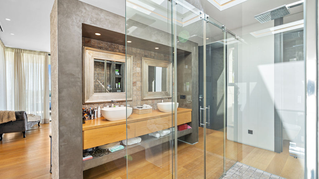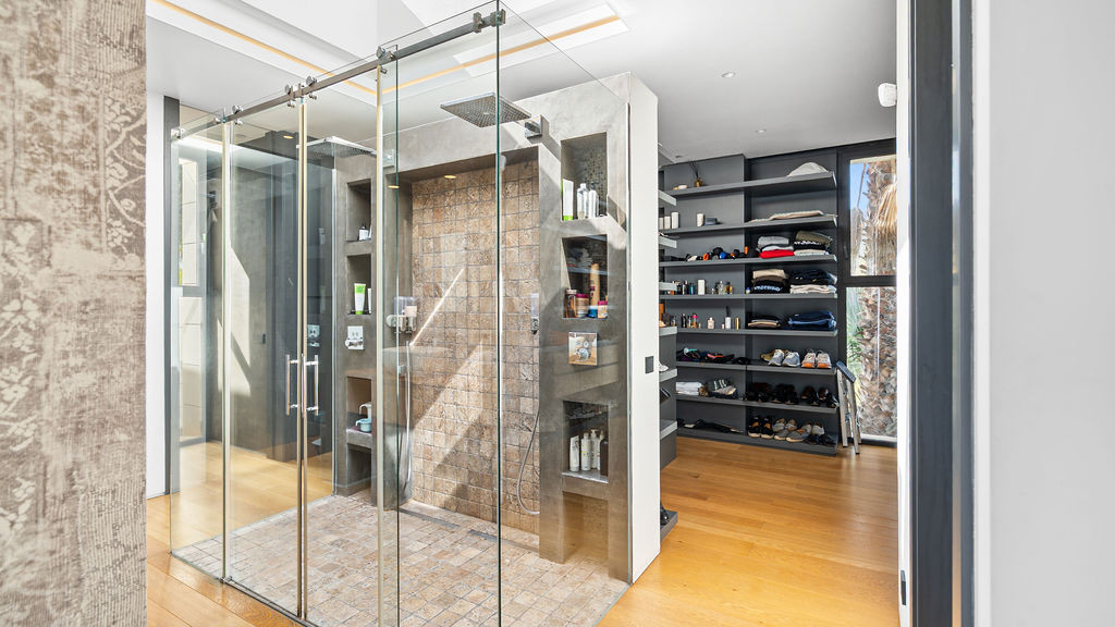 One of the home’s most memorable features is the master suite’s double shower beneath a full-height glass skylight. Picture yourself standing under the open sky during a rare Marbella rain, it’s both calming and unforgettable.
