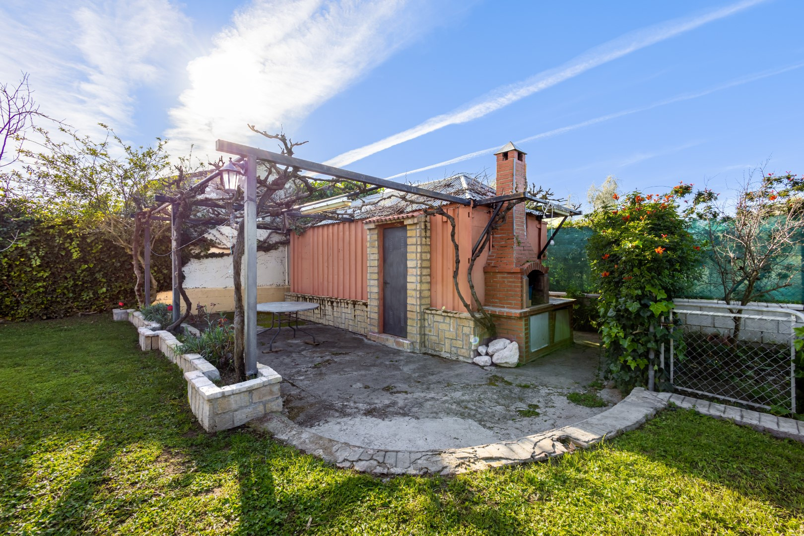 Cuenta con una zona exterior para almacenaje extra y una zona de barbacoa, además de zona de aparcamiento para varios vehículos.